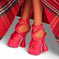 - Stylizację podkreślają częściowo upięte brązowe włosy, czerwone usta, złociste metaliczne paznokcie i dopasowane kolorystycznie buciki na obcasie.