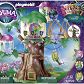 Playmobil Drzewo Wróżek 70799. Drzewo społeczności to miejsce, w którym wróżki mieszkają i znajdują schronienie. Podczas gdy wróżki gotują w kuchni, spędzają czas we wspólnym pokoju lub patrzą na gwiazdy w obserwatorium, zwierzęta odpoczywają poniżej w specjalnie dla nich wygospodarowanej przestrzeni. W najwyższej wieży znajduje się projektor, który może stworzyć gwiaździste niebo na suficie dziecięcej sypialni, podczas gdy lampiony na drzewach świecą w ciemności. Pozwala to wróżkom i ich zwierzęcym towarzyszom zapaść w zaczarowany sen.